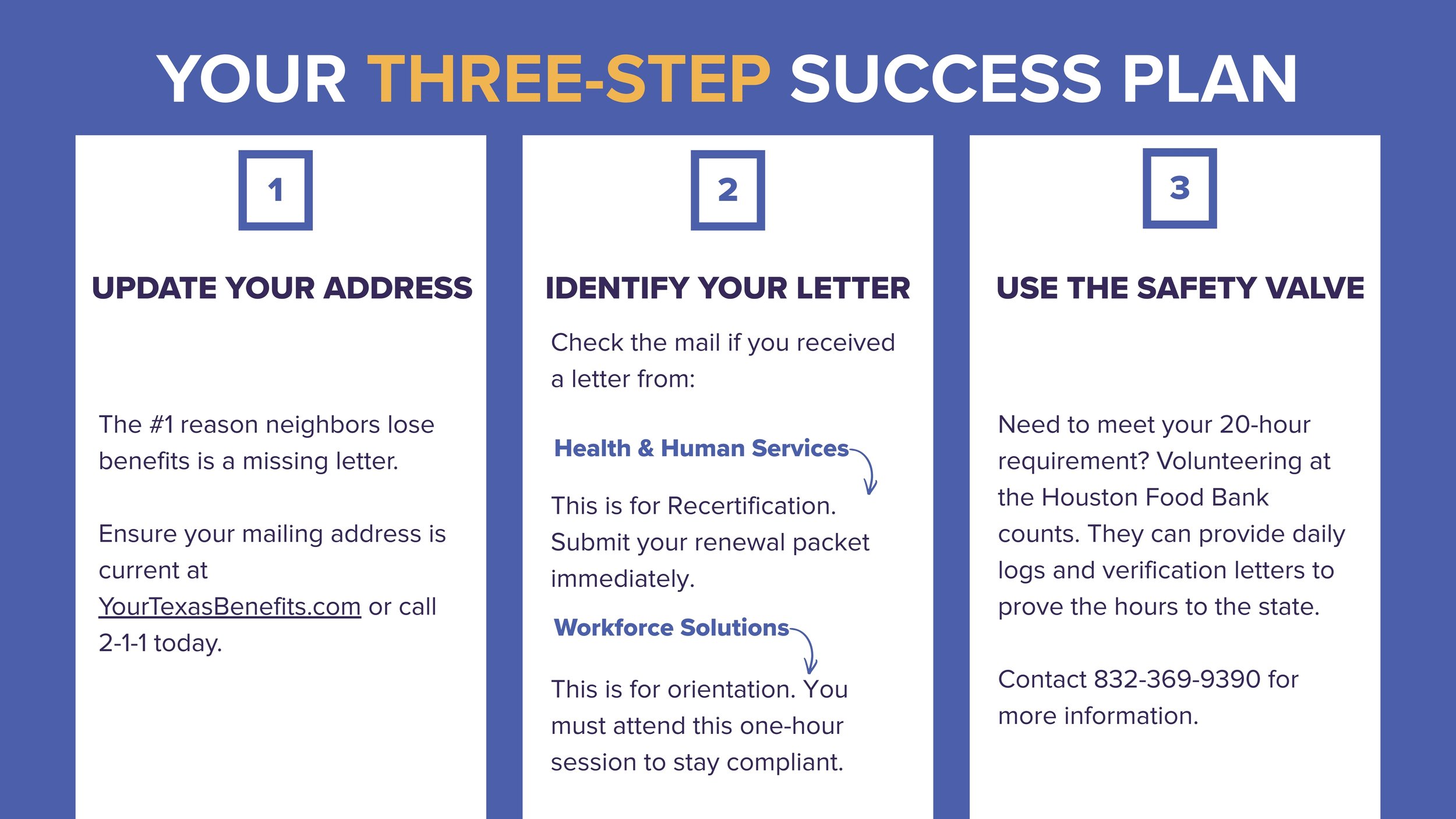 - Make sure your contact information is up to date with Texas Health and Human Services by logging on to YourTexasBenefits.com or calling 2-1-1